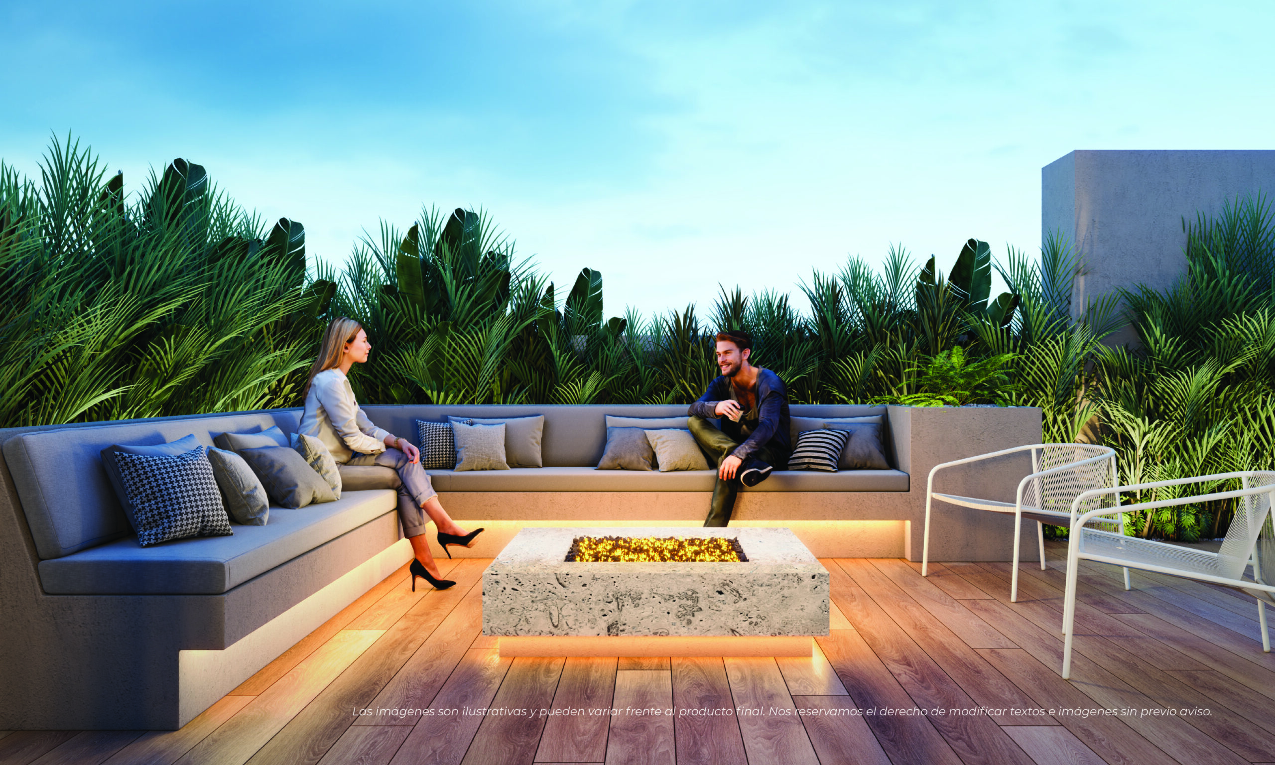 Nuestros apartamentos han sido diseñados con una visión contemporánea y funcional, alineada con las tendencias actuales del mercado de renta. KB cuenta con 10 áreas sociales diseñadas para mejorar la experiencia de vida y aumentar el valor percibido del inmueble. Estas incluyen social kitchen, sky lounge, zona fire pit, gimnasio al aire libre, coworking, zona BBQ, simulador-teatrino, entre otros espacios modernos y funcionales.